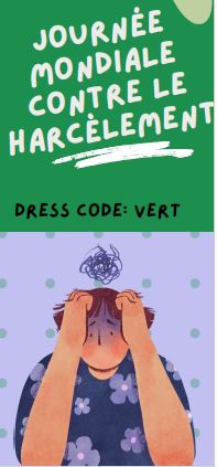 Code couleur : Cette journée sera placée sous le signe du Vert, couleur de l’espoir et de la lutte contre le harcèlement. Nous vous encourageons tous à porter un vêtement ou un accessoire vert pour montrer votre engagement.